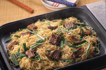 - 色拉油(1又1/2大匙)倒在铁板上加热,放鳗鱼快速翻炒,加一圈酒,待酒蒸发后取出。