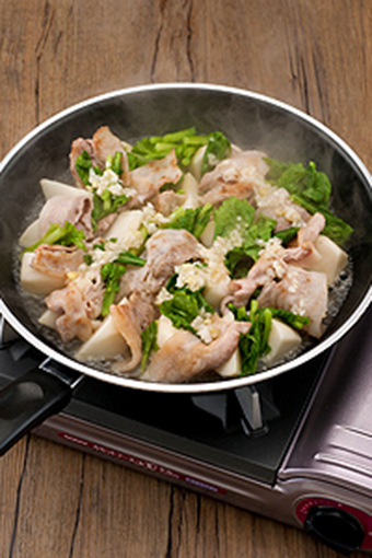 • 平底炒锅用中火把油烧热,炒猪肉,变色后加芜菁和芜菁叶,加一圈酒后盖上盖子。调至小火闷煮3~4分钟,打开盖子,加入调料A,关火即可。