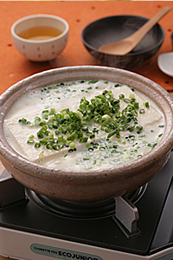 锅中倒入豆浆,加入海鲜素和盐。放进豆腐小火炖煮至熟。将豆腐弄碎勺起,与汤汁分离,再撒上葱花,适量加点柚子胡椒即可享用。